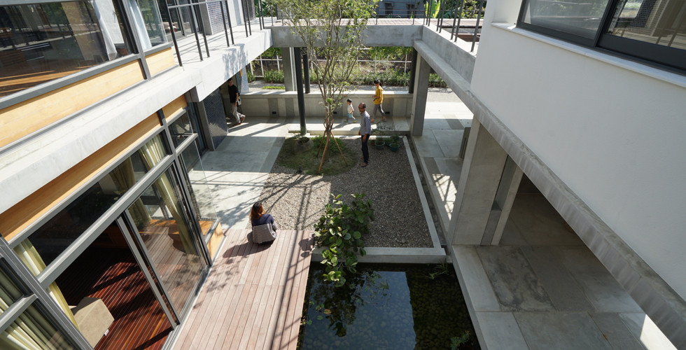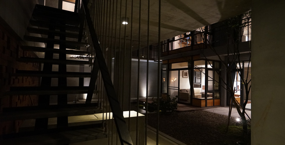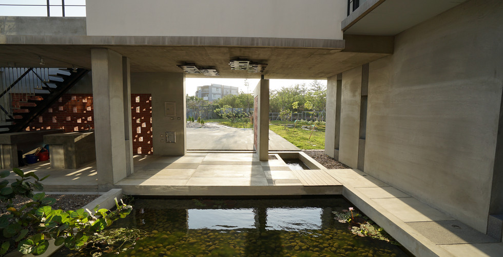 於是,為了給予舊建物有別過往的新生命,我們嘗試打破原有符號性強烈的立面,並以加法的方式試圖圍塑出一個小型的群落,有別於一開始原本打算整修原單棟建物整修的想法,透過部分量體及牆面的新建,圍出中庭及半戶外的空間,讓家有一個容納四季的植物與陽光的核心、也希望風與水能在這個小聚落裡流動。