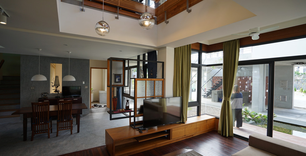 傍晚時分沿著省道開進蜿蜒的產業道路中,經過好幾座跨越嘉南平原灌溉溝渠的小橋,把車停在廟埕裡,走進家中。進門後在玄關脫了鞋子打赤腳踩在磨石子地板上,開啟餐廳的燈,進入客廳廚房或者上樓;找一個靠近暖爐的角落坐下,拉開向南中庭的落地窗簾望著有月光倒影的水池;音響開啟,緩緩的音樂穿過挑空竄進二樓書房。坐在二樓高架木地板上,自然而然的將身體重心放低,透過挑空的圓形吊燈反射在天花的迷幻燈光,和著傳來的嘻鬧聲、音樂及佳餚香味就能發呆上好一陣子。