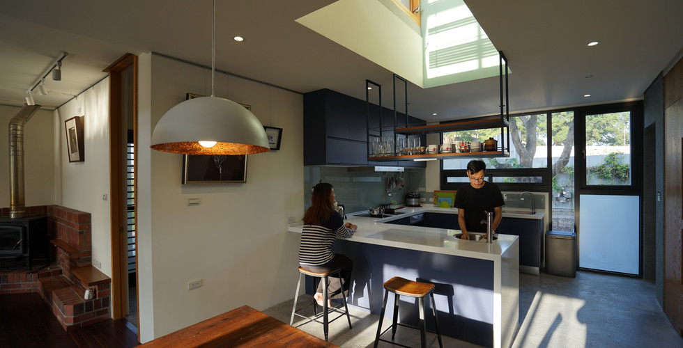 建議保留舊建物立面窯燒藍色磁磚,是與業主的共識。為了修補舊有磁磚,我們將部分敲除的牆面上磁磚小心地保留並與毀損的替換,並加入了抿石子的材質,襯托舊有磁磚的質感及顏色。室內打除了原有階高過高的樓梯,及部分的樓板與隔間,引入光線,改善原中段採光不佳的問題,也於新建樓梯上二樓的端景,創造了一個小中庭,引進的陽光綠意及促進熱的對流,希望能創造一個在鄉間不用空調的環境。